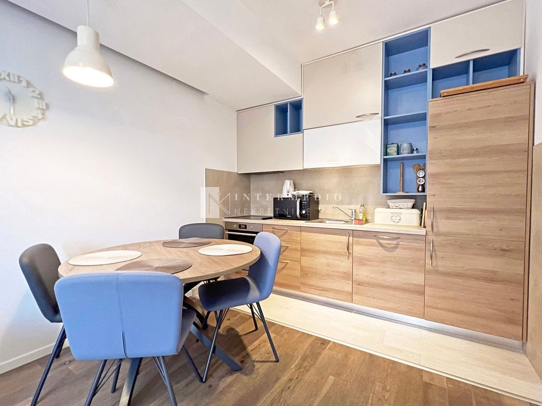 Podovi su od parketa i plocica, stan dolazi namjesten, sa ugradnom kuhinjom i dva klima uredjaja.